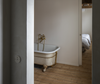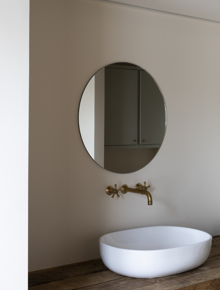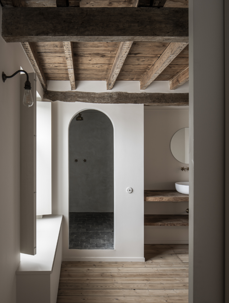 Under rustikke træbomme, ligger badeværelset i ledtog med soveværelse og garderobe. Det antikke stålbadekar var oprindeligt en del af huset, men er i renoveringen blevet rykket fra første til anden sal. Det tunge badekar hviler på solide løvefødder i massiv messing, som går igen i det væghængte Christiansborg-armatur, der udover dets funktion bidrager til rummets sans for gammelt håndværk.