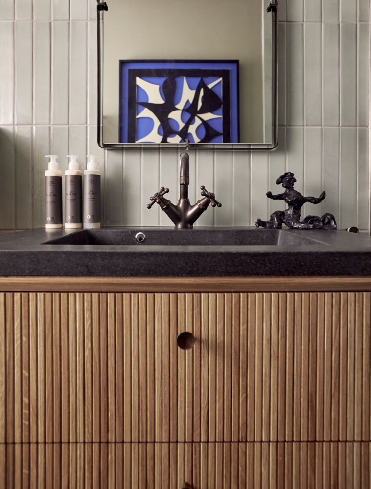 På badeværelset er gæsterne omgivet af håndmalede fliser, der lyser rummet op i en beroligende, grøn tone, som danner en elegant kontrast til det snedkererede badeværelsesmøbel, lampeklassikere og Christiansborg-armaturet, der pryder både håndvasken og bruseren på badeværelset i en bruneret overflade.