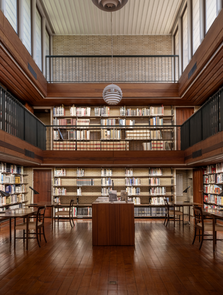 Biblioteket er et af de helt centrale rum. Let skjulte lyskilder oplyser det mørke træværk og de stablede bogreoler, mens det høje loft er prydet med PH-lamper. På trods af dets storladne udtryk, er atmosfæren rolig og kontemplativ, hvilket giver forskere og studerende mulighed for at koncentrere sig om deres studier.