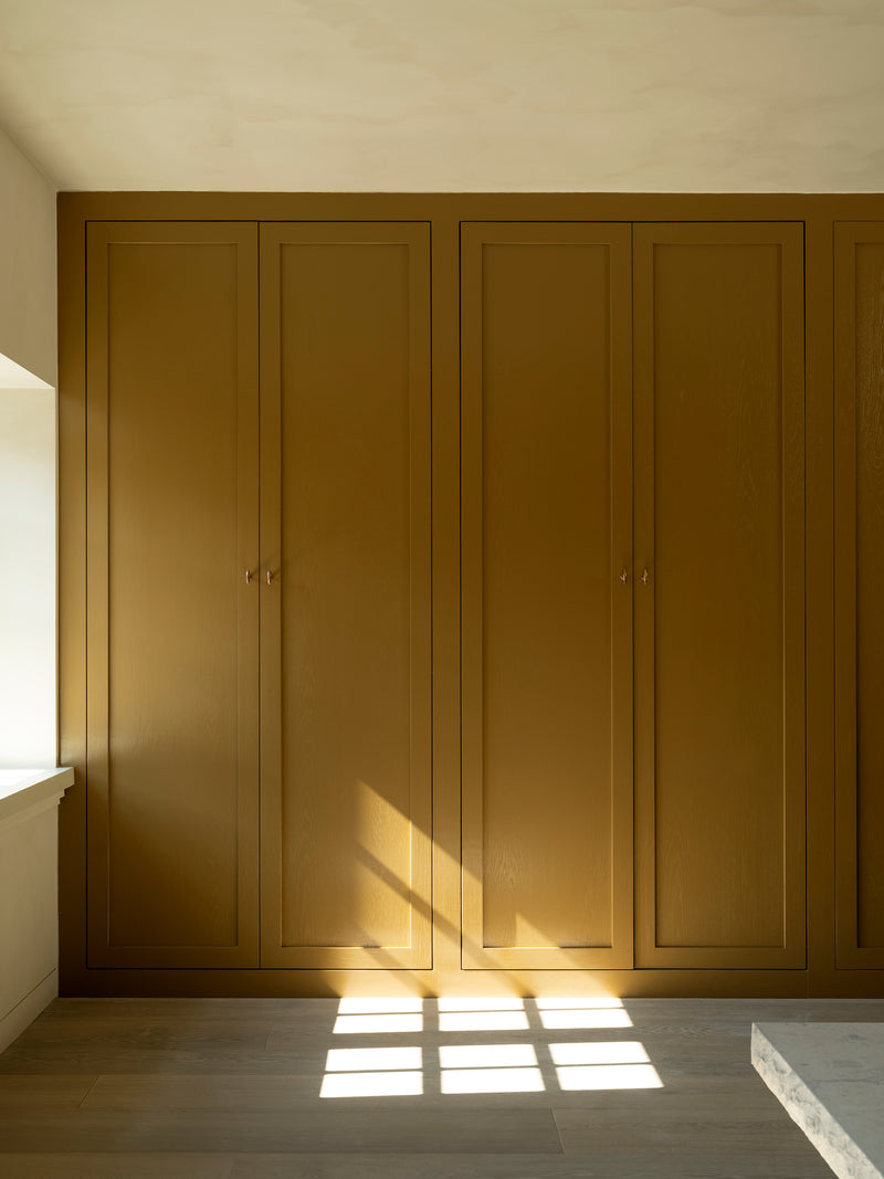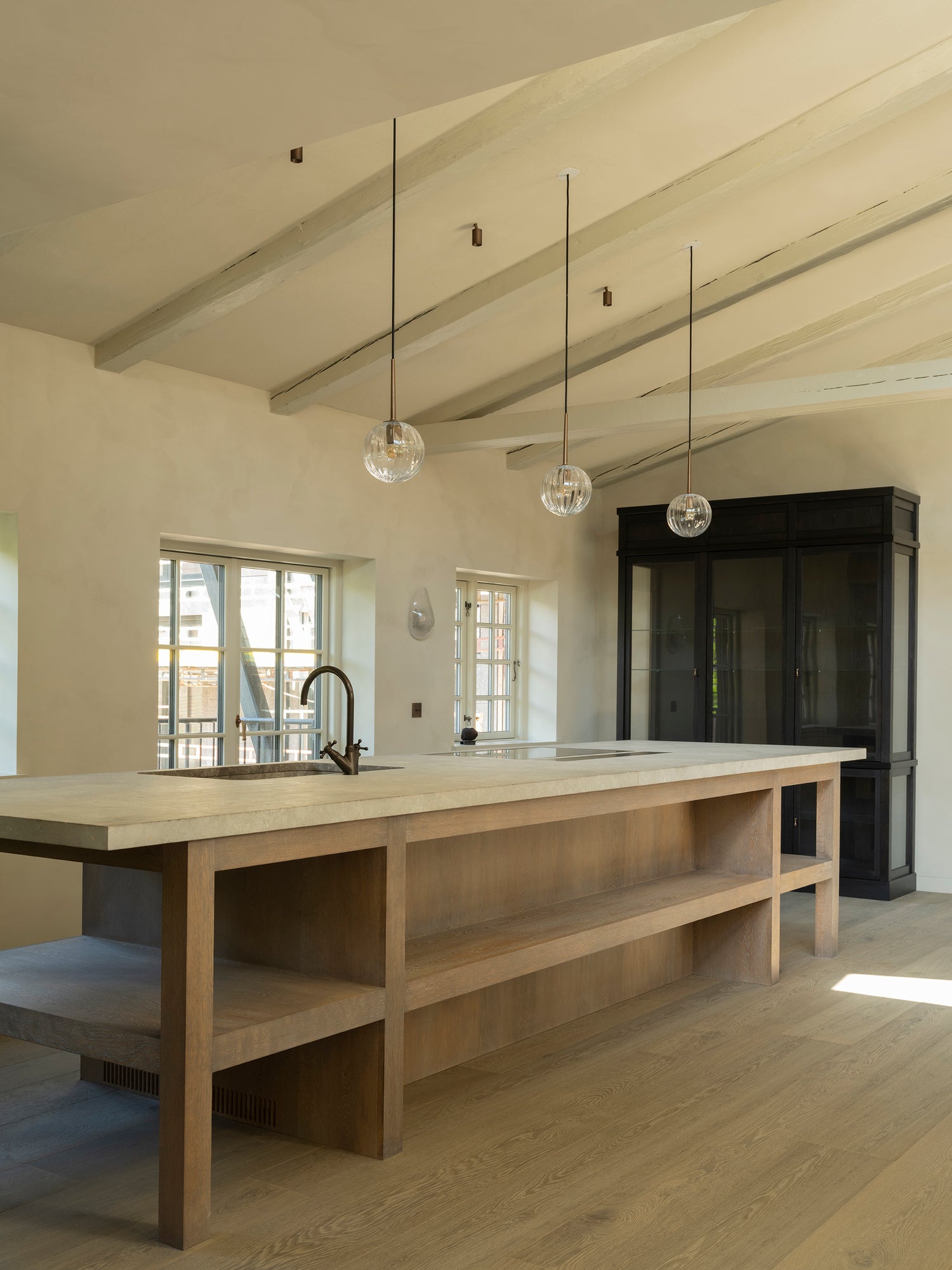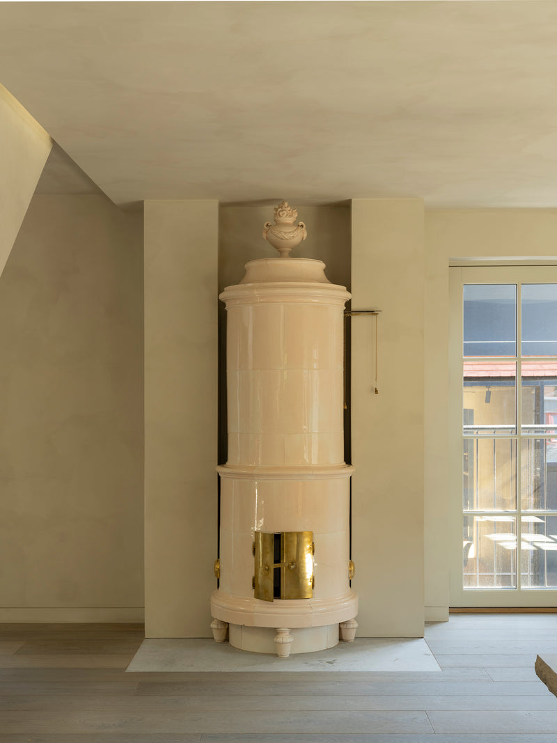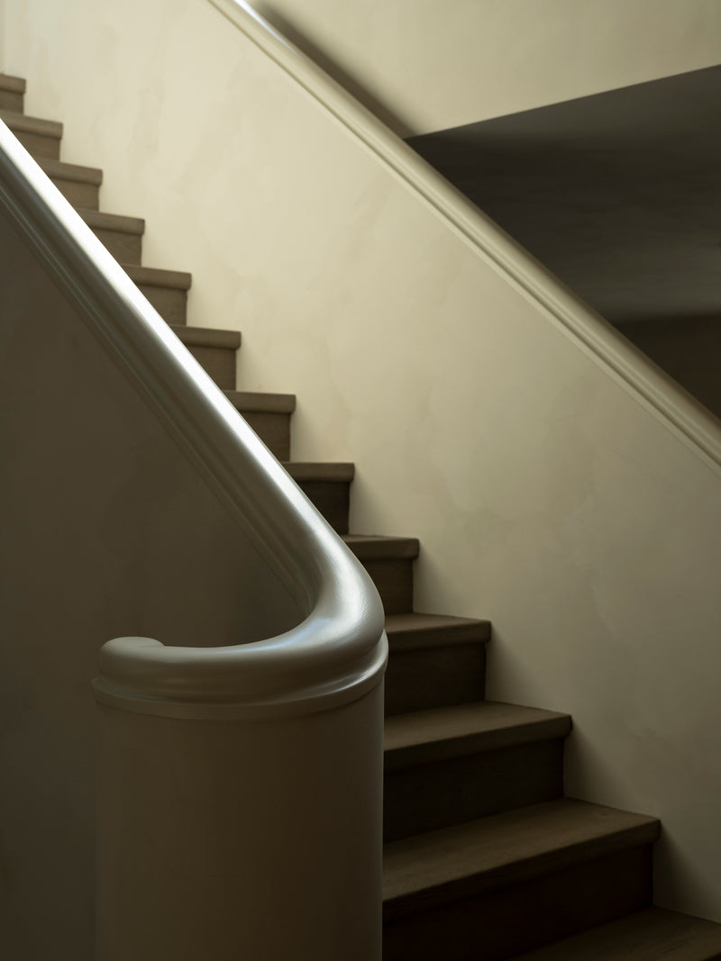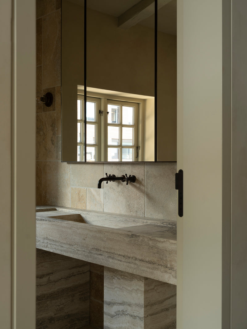 Interiøret er holdt i en dæmpet, taktil palette, hvor Christiansborg-armaturer og tilbehør i bruneret messing tilføjer et diskret metallisk modspil. Kombinationen af håndgjorte metaloverflader og St. Leos mineralske teksturer skaber et helhedsudtryk, der føjer sig naturligt ind i bygningens historiske fortælling.