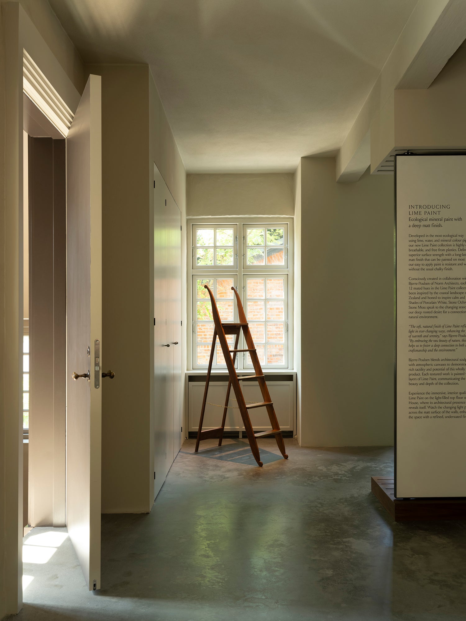 St. Leo, etableret i København i 2019, arbejder ud fra en skandinavisk forståelse for materialitet, ro og håndværk. I showroomet møder denne filosofi husets rå historie. Vægge og flader er iscenesat som et materialelaboratorium, hvor farver og overflader opleves i samspillet med lys, proportioner og bygningens industrielle strukturer.